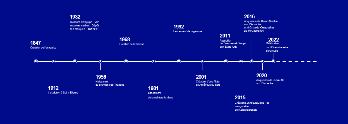 “C’est en 1847, dans le nord de la France, que l’entreprise qui allait devenir le Groupe Thuasne a été créée. Depuis des décennies, des milliers de collaborateurs se sont engagés à nos côtés avec un seul objectif : la santé. C’est cette passion commune qui nous anime aujourd’hui encore et pour de nombreuses années.”