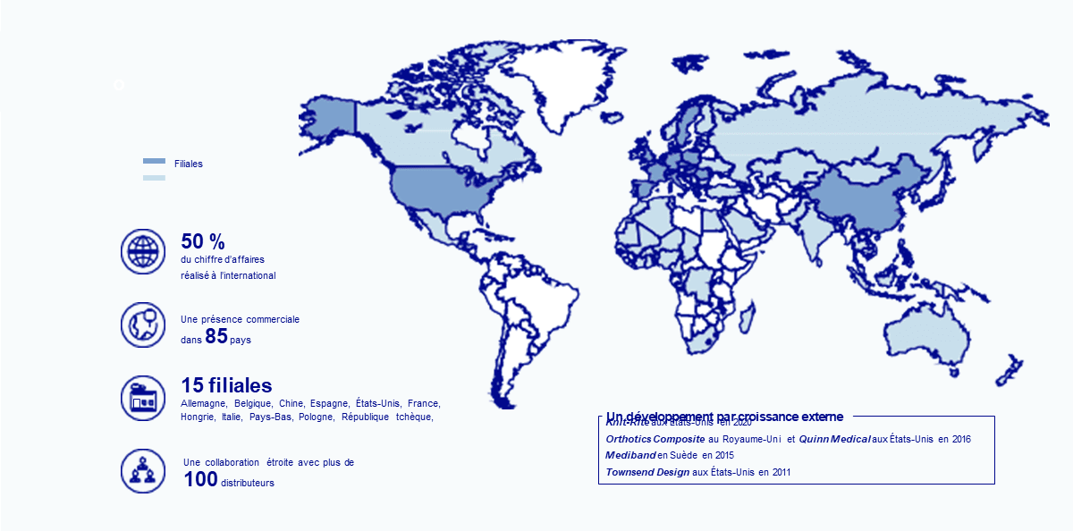 Thuasne® s’est appuyé sur sa position d’acteur majeur sur le marché français et a adopté une stratégie de conquête progressive de territoires depuis une trentaine d’année : d’abord en Europe, puis dans le reste du monde. Avec quinze filiales en Europe, aux États-Unis et en Asie, Thuasne est aujourd’hui l’un des acteurs majeurs sur le marché des dispositifs médicaux à l’international.